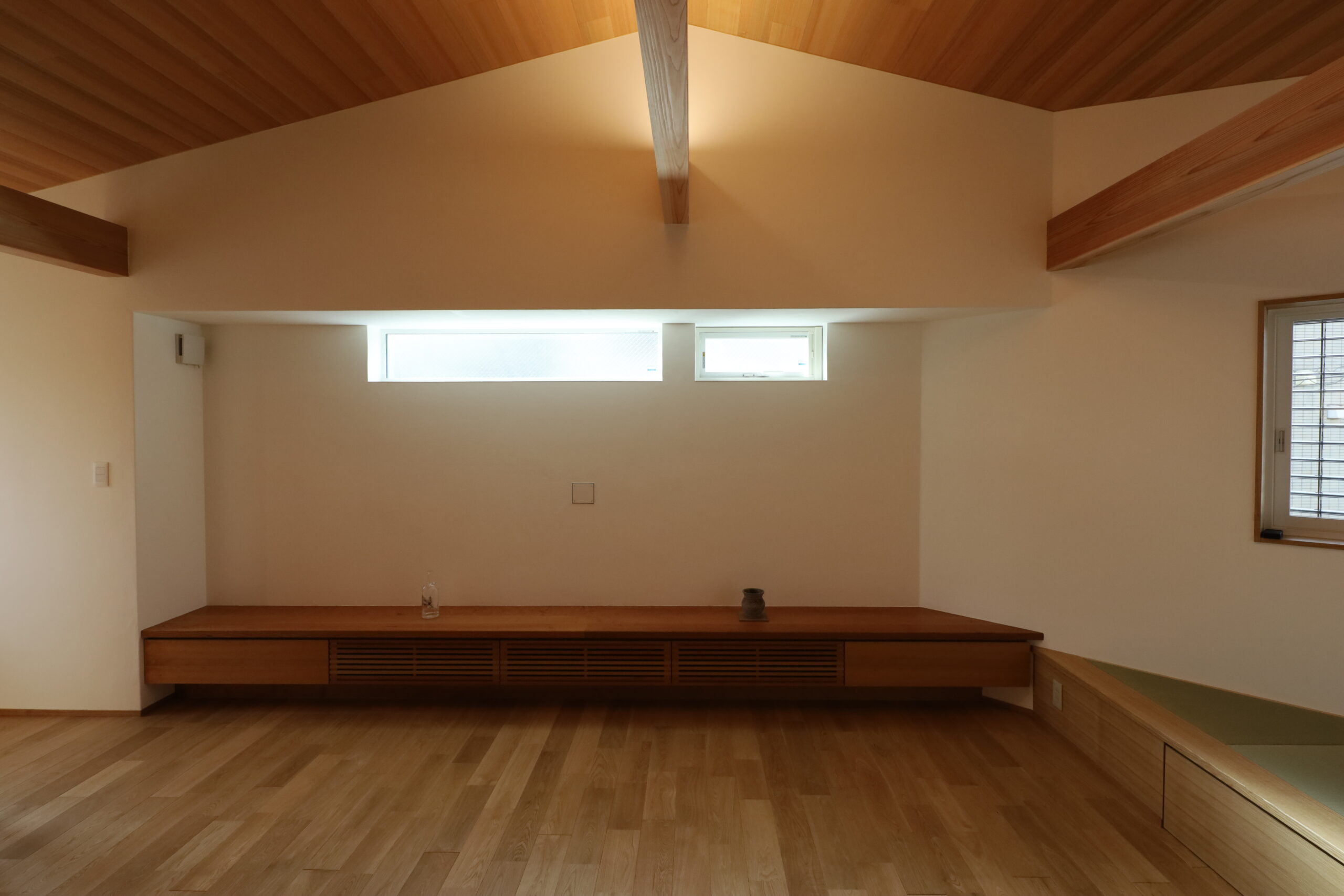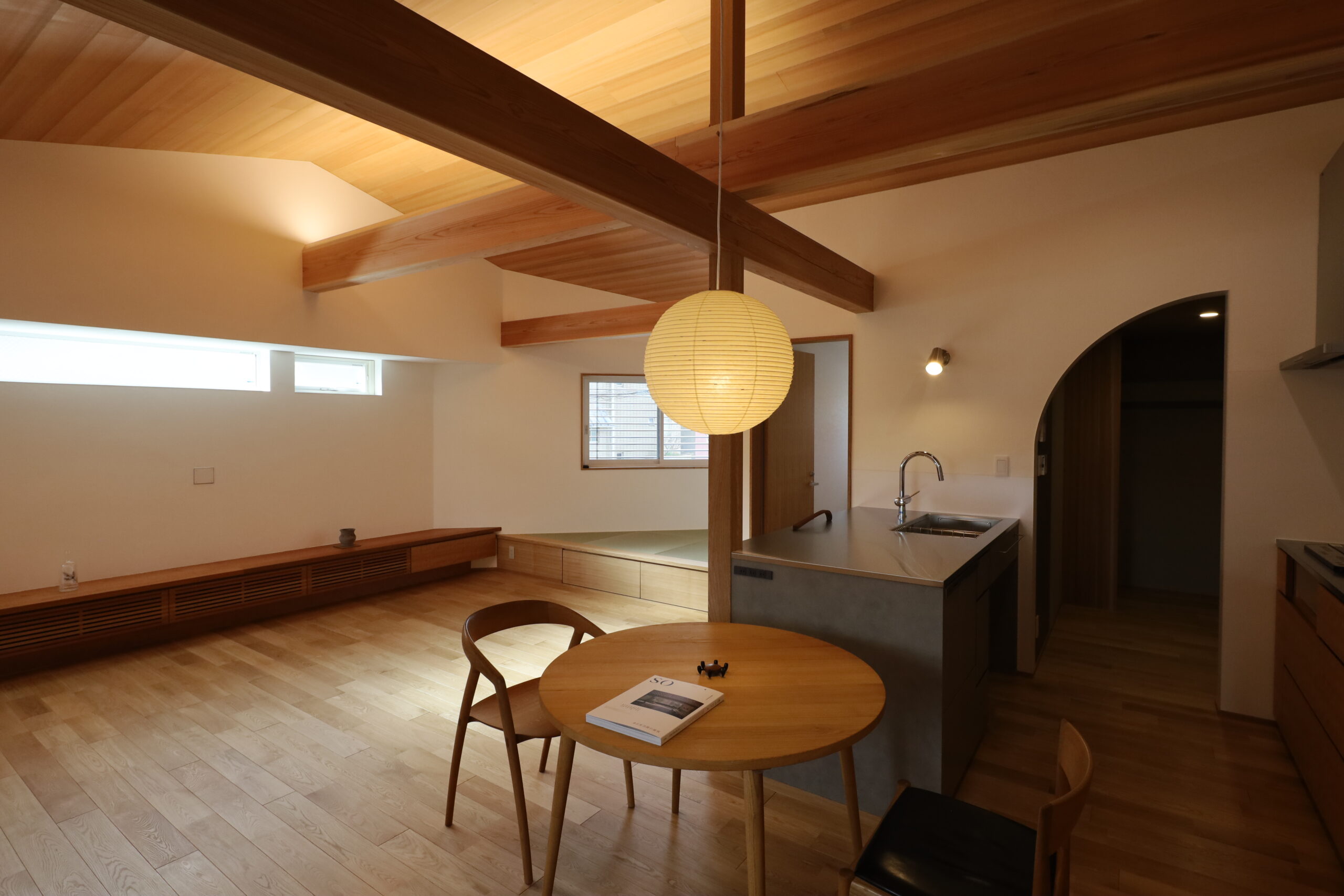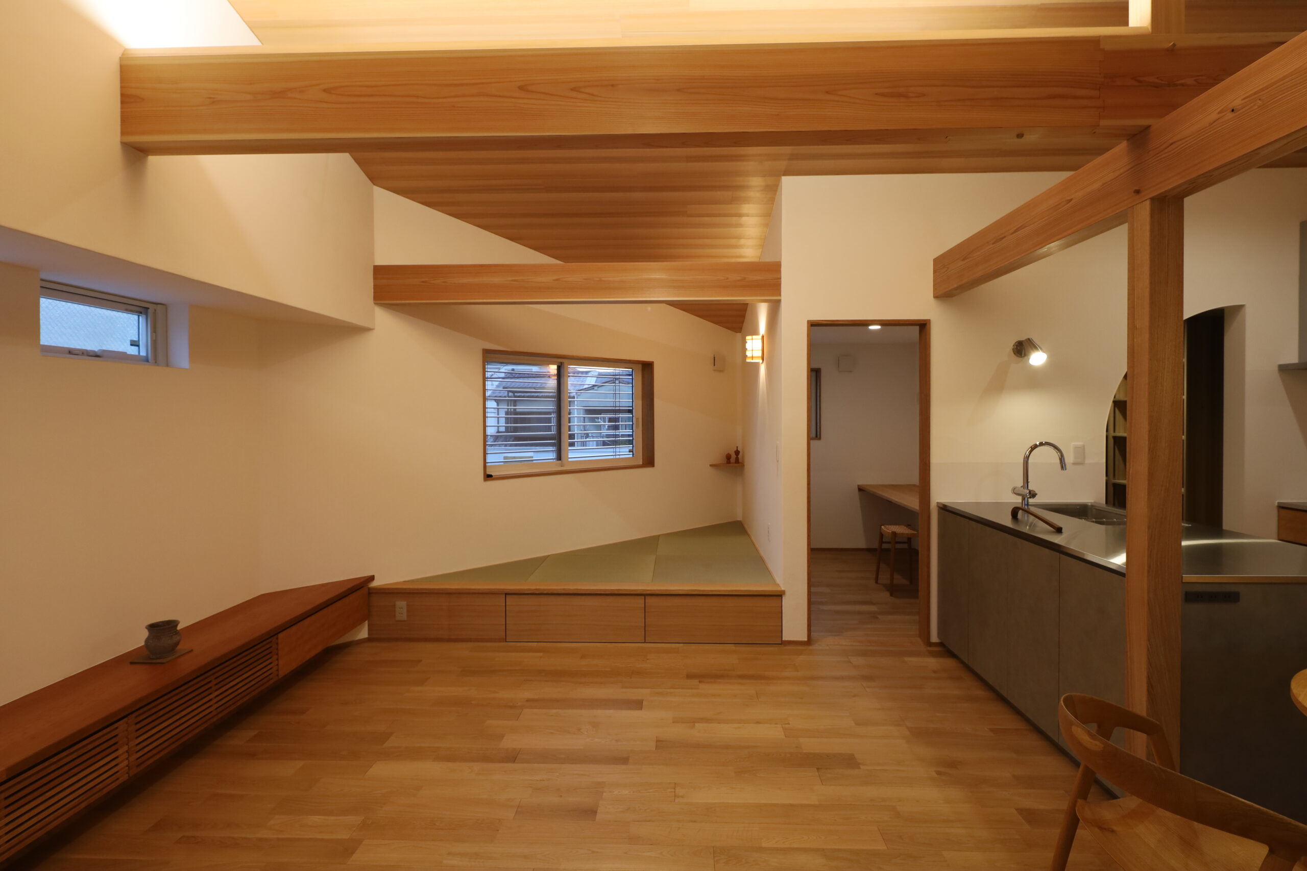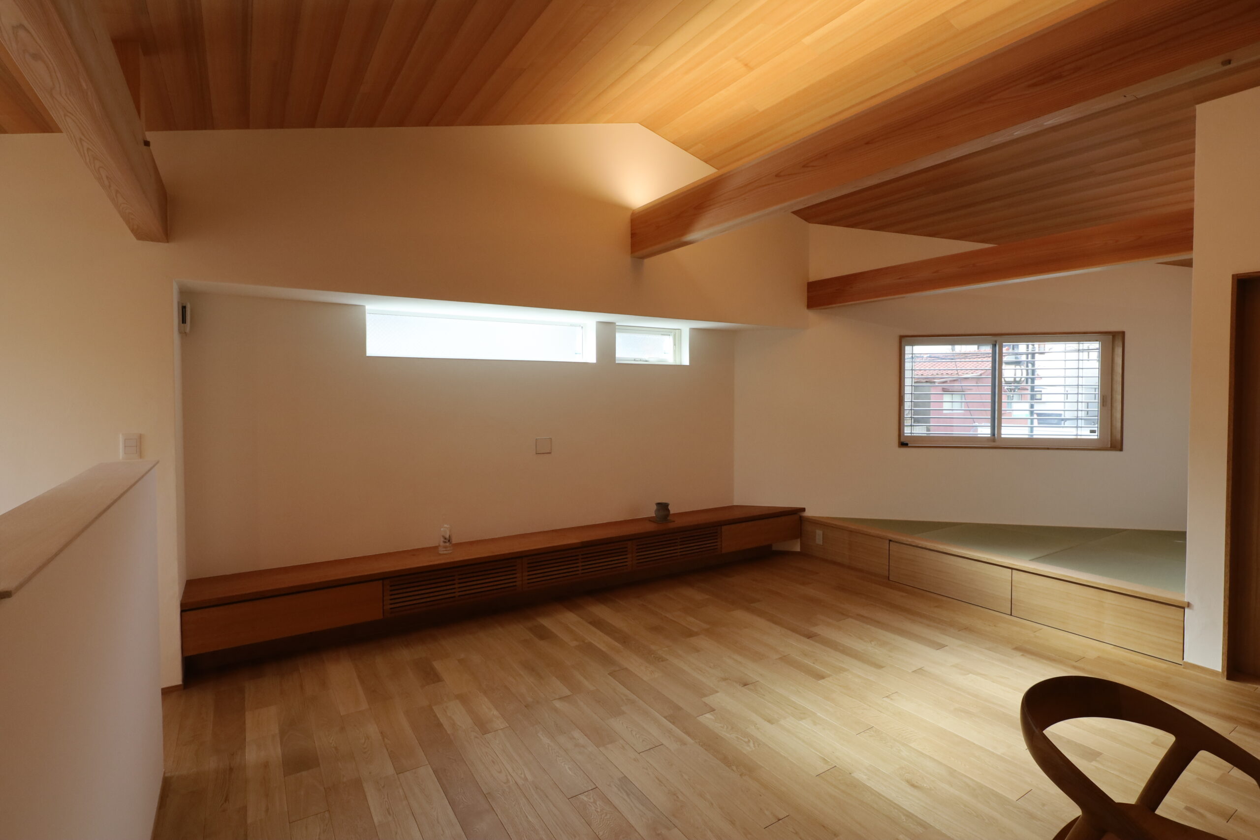 三角の角部分には小上がりの畳 とし、下部は収納