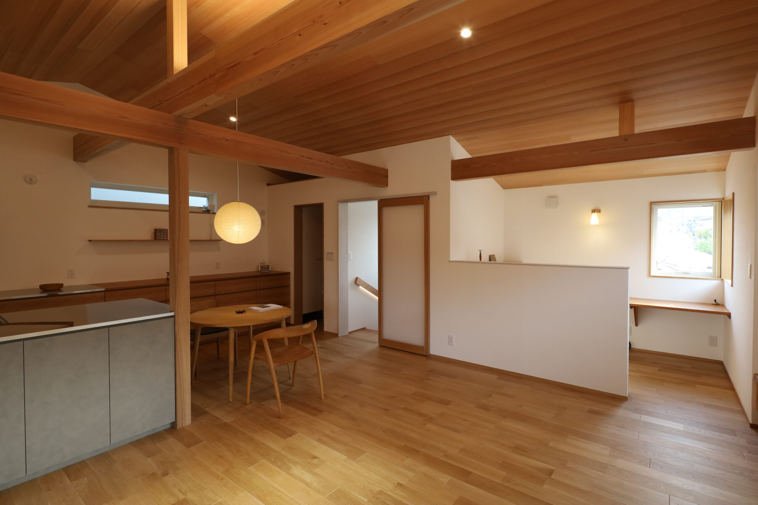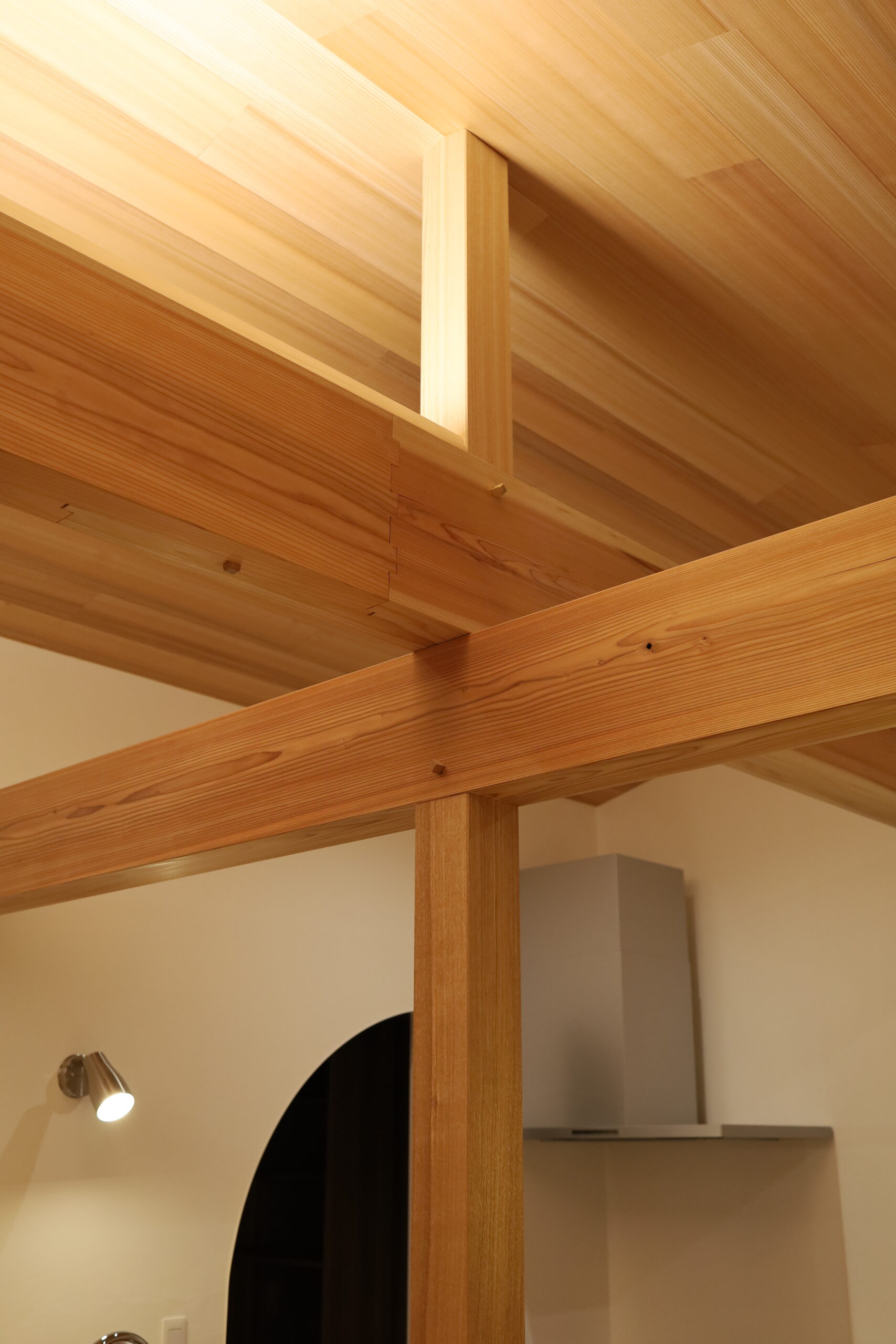 勾配天井に柱梁の構造材を縦横に現して