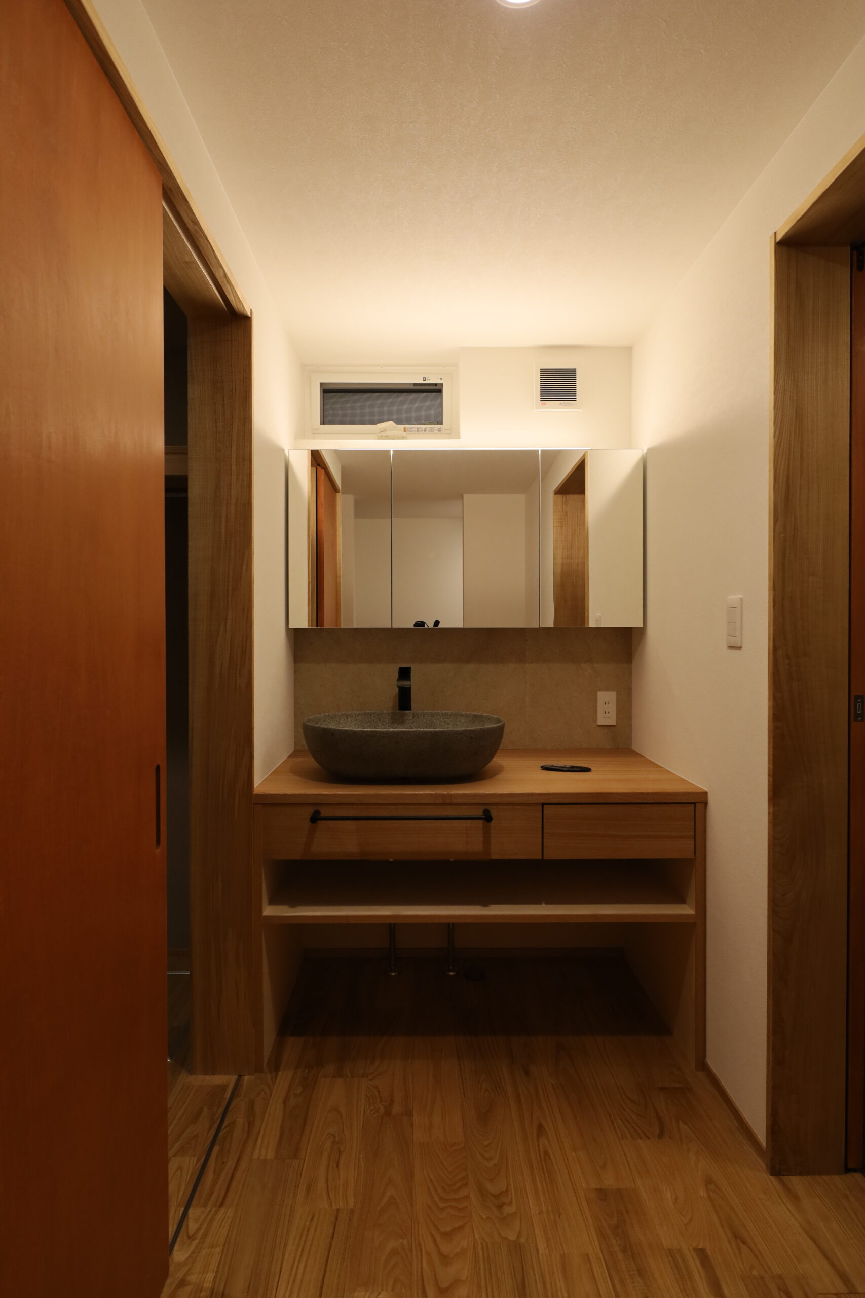 造作の洗面台の正面ミラーボックス下の壁は、竜山石のタイル