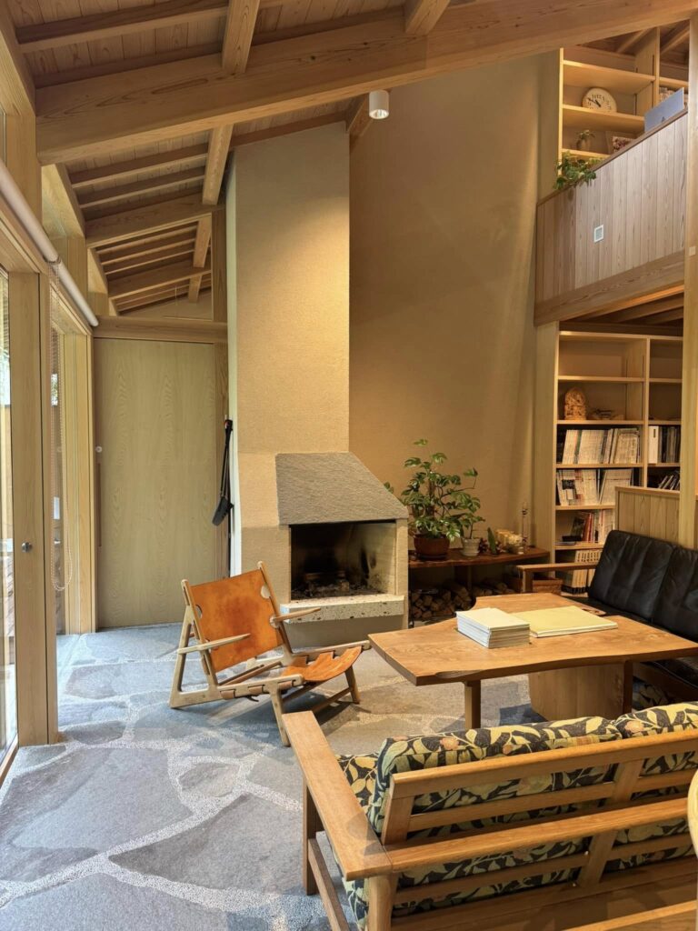 庭に繋がる居間と暖炉。